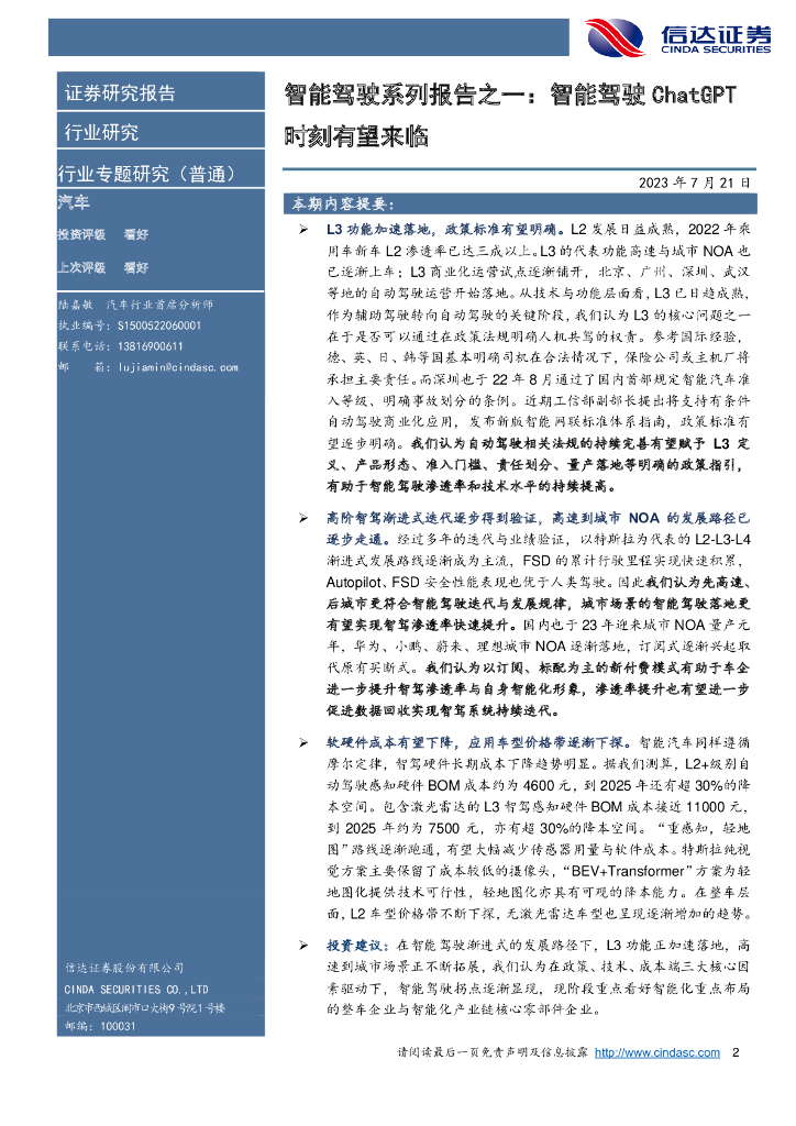 信达证券:智能驾驶系列报告之一:智能驾驶ChatGPT时刻有望来临.pdf