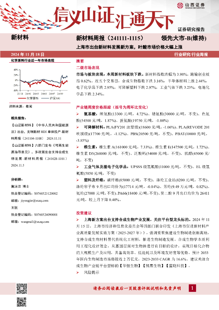 山西证券:新材料行业周报:新材料周报(241111-1115)上海市出台新材料发展新方案,叶酸市场价格大幅上涨.pdf