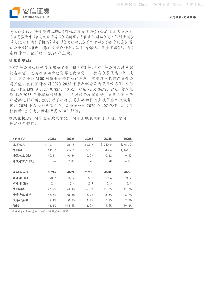 安信证券:光线传媒(300251)-核心电影业务恢复显著,23年下半年起待播项目充足.pdf