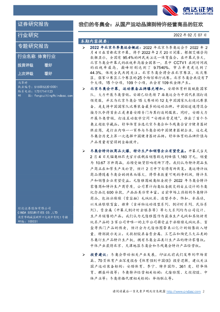 信达证券:体育行业冬奥会最全盘点——体育产业专题研究报告:我们的冬奥会:从国产运动品牌到特许经营商品的狂欢.pdf