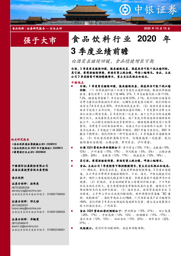 中银证券:食品饮料行业2020年3季度业绩前瞻:白酒需求继续回暖,食品稳健增长可期.pdf