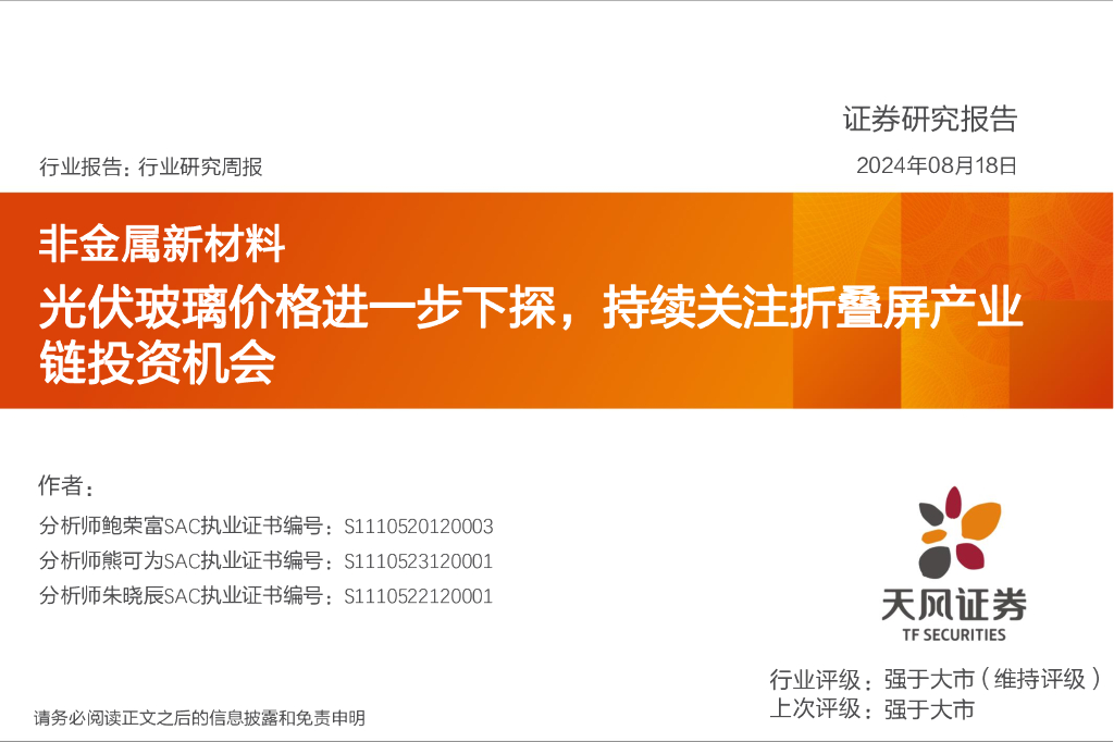 天风证券:非金属新材料行业研究周报:光伏玻璃价格进一步下探,持续关注折叠屏产业链投资机会.pdf
