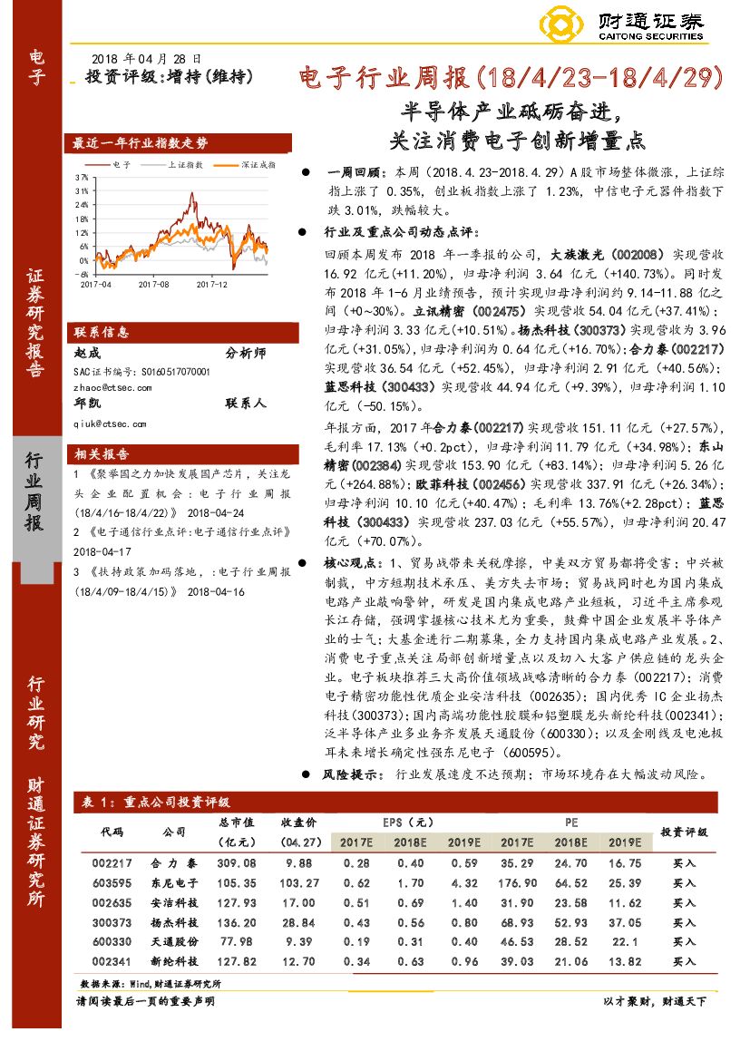 财通证券:电子行业周报(18/4/23-18/4/29):半导体产业砥砺奋进,关注消费电子创新增量点.pdf