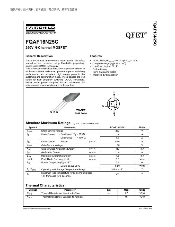 FAIRCHILD FQAF16N25C 250V N-Channel MOSFET 数据手册(1)(1).pdf
