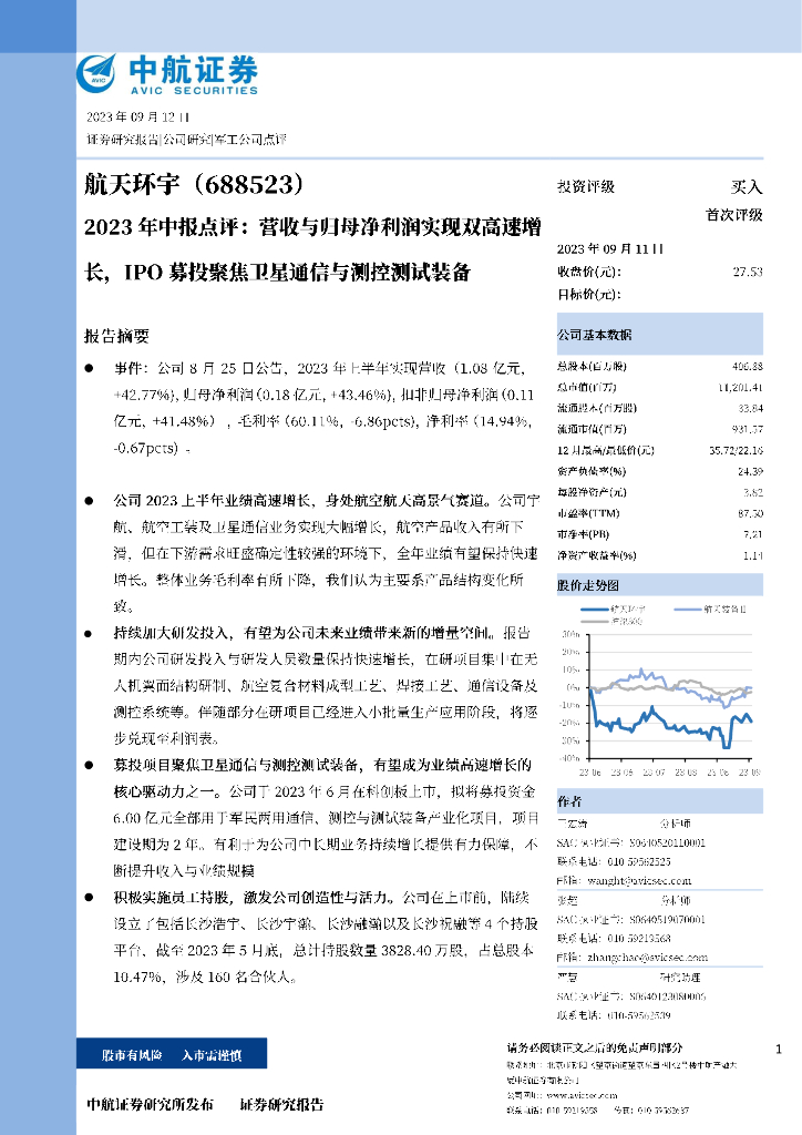 中航证券:航天环宇(688523)-2023年中报点评:营收与归母净利润实现双高速增长,IPO募投聚焦卫星通信与测控测试装备.pdf