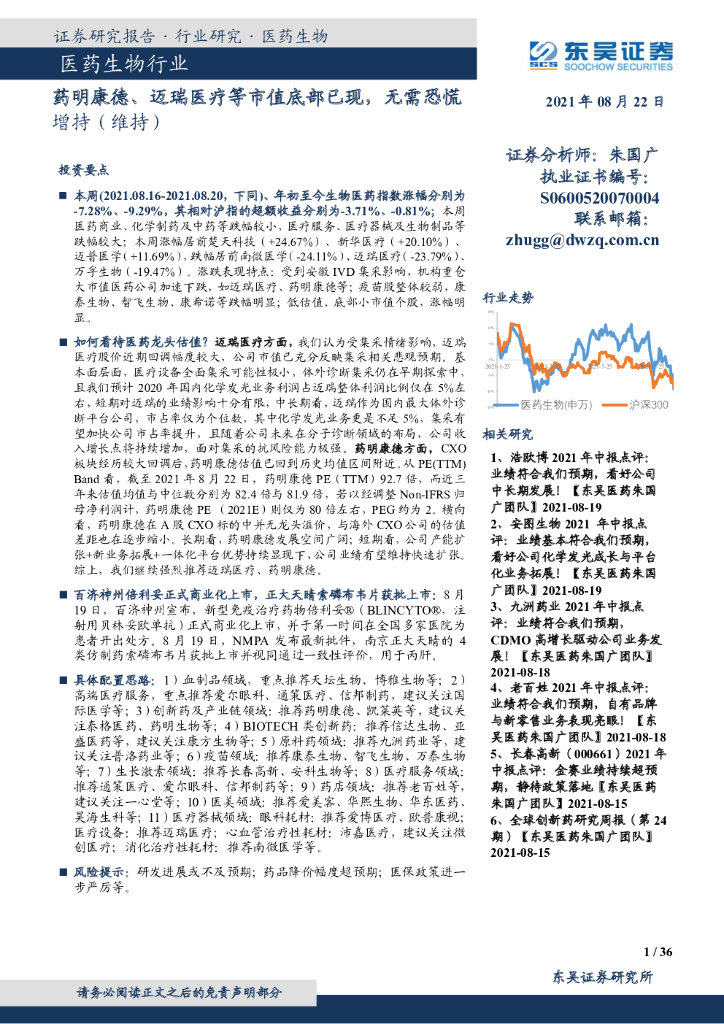 东吴证券:医药生物行业:药明康德、迈瑞医疗等市值底部已现,无需恐慌.pdf