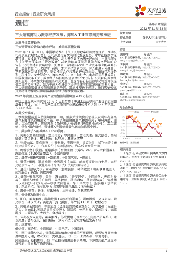 天风证券:通信行业研究周报:三大运营商助力数字经济发展,海风&工业互联网持续推进.pdf