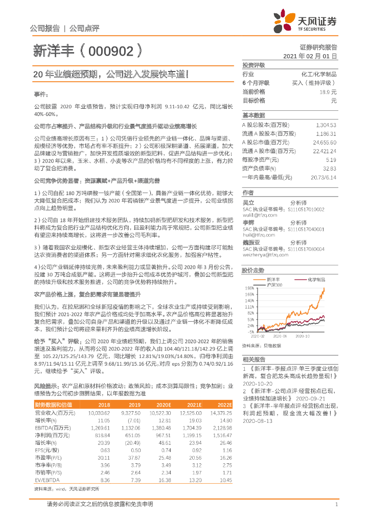 天风证券:新洋丰(000902)-20年业绩超预期,公司进入发展快车道!.pdf