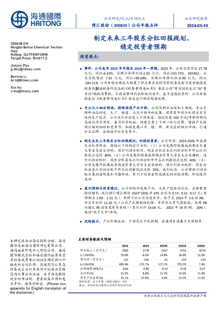 海通国际:博汇股份(300839)-公司年报点评:制定未来三年股东分红回报规划,稳定投资者预期.pdf