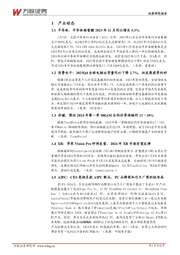 万联证券:电子行业周观点:CES亮相多款AIPC新品,苹果Vision Pro即将发售.pdf