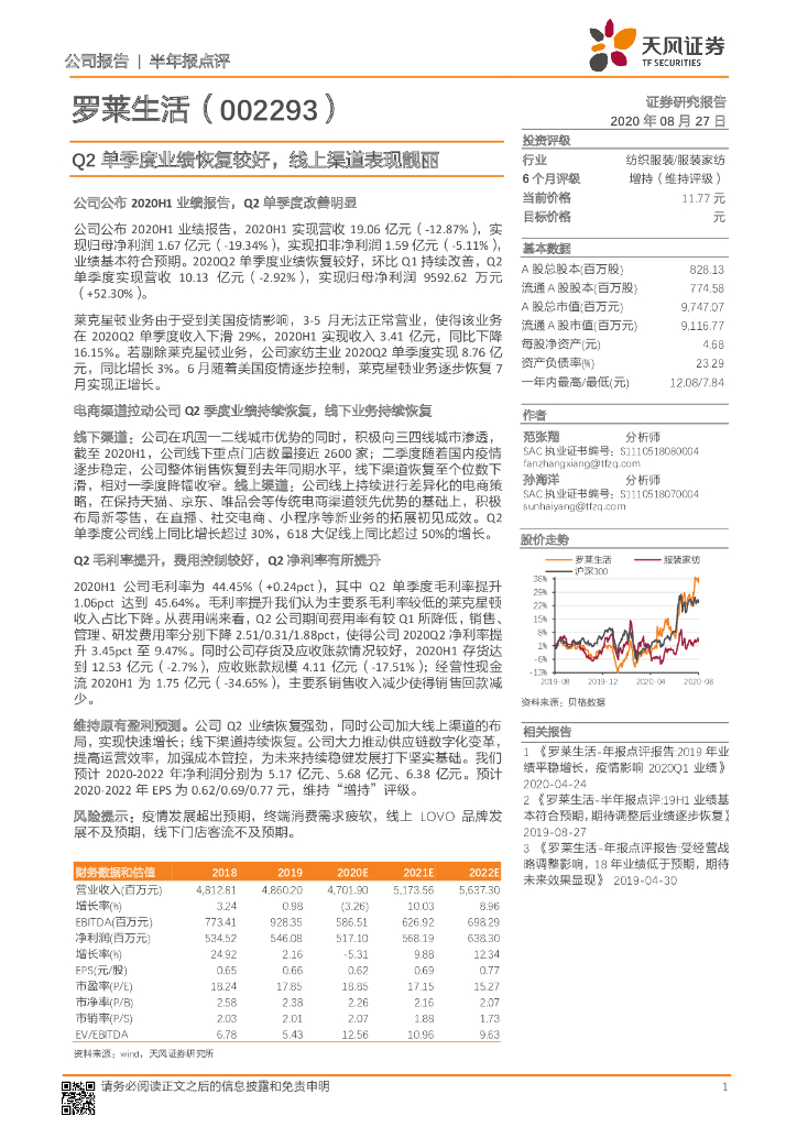天风证券:罗莱生活(002293)-Q2单季度业绩恢复较好,线上渠道表现靓丽.pdf