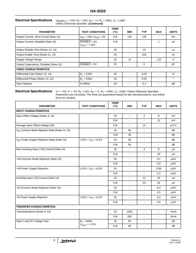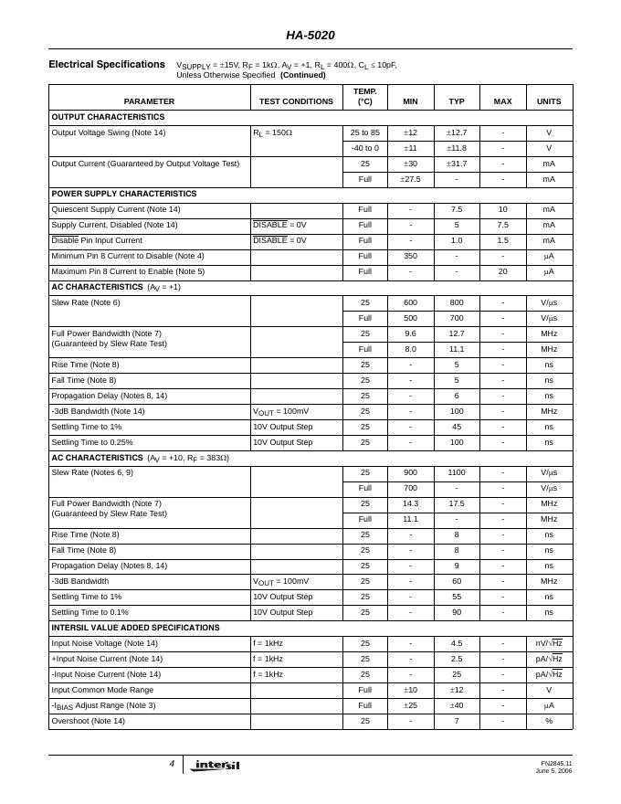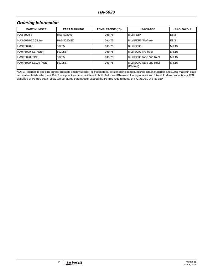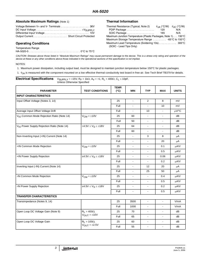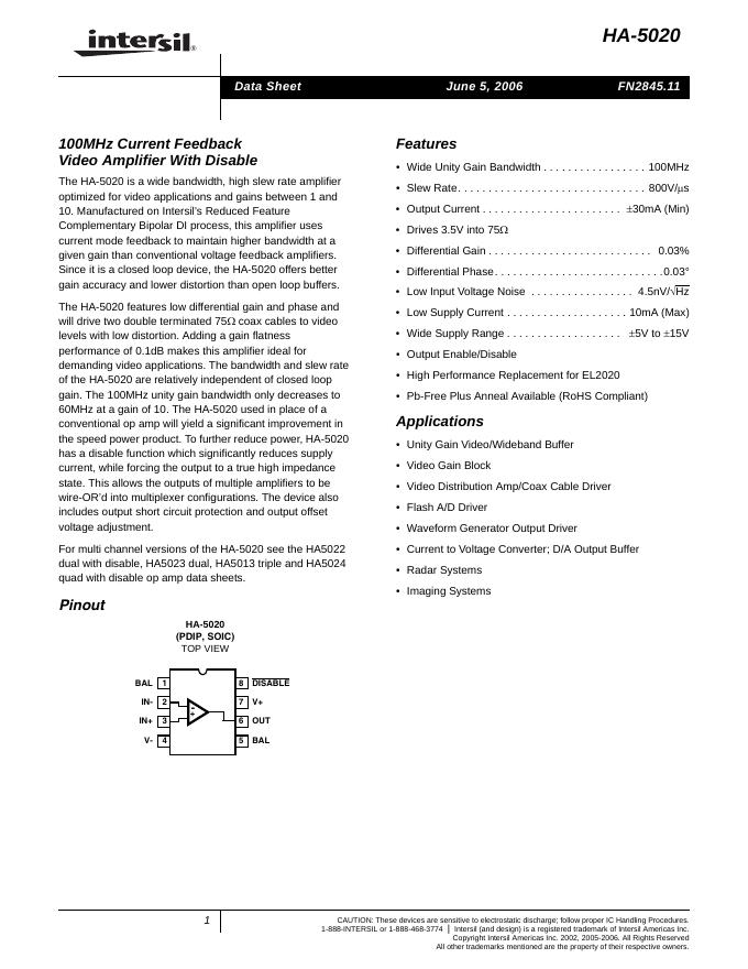 INTERSIL HA-5020 100MHz Current Feedback Video Amplifier With Disable 数据手册.pdf