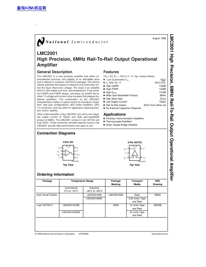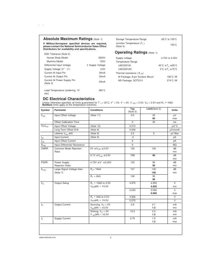 national semiconductor LMC2001 High Precision, 6MHz Rail-To-Rail Output Operational Amplifier 数据手册.pdf