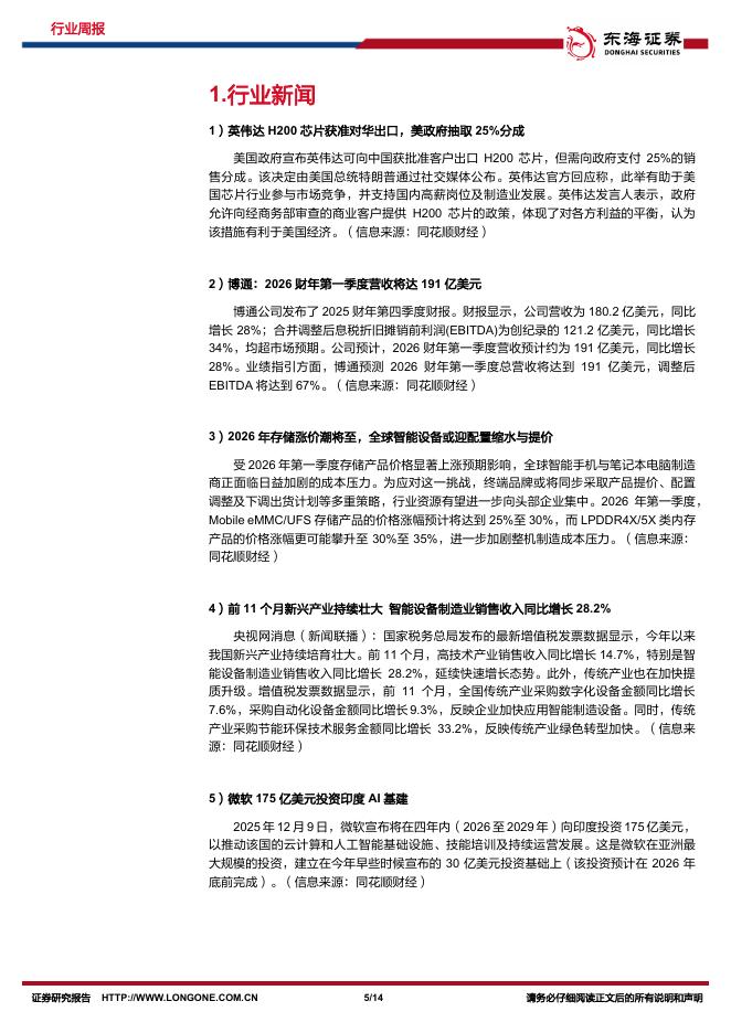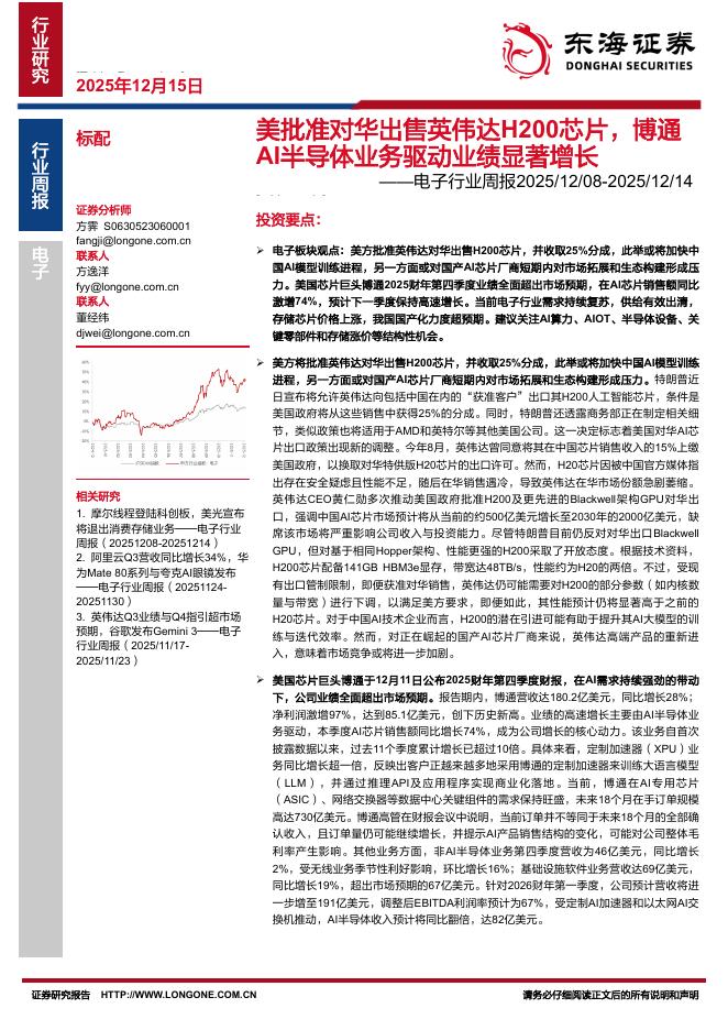 东海证券:电子行业周报:美批准对华出售英伟达H200芯片,博通AI半导体业务驱动业绩显著增长.pdf