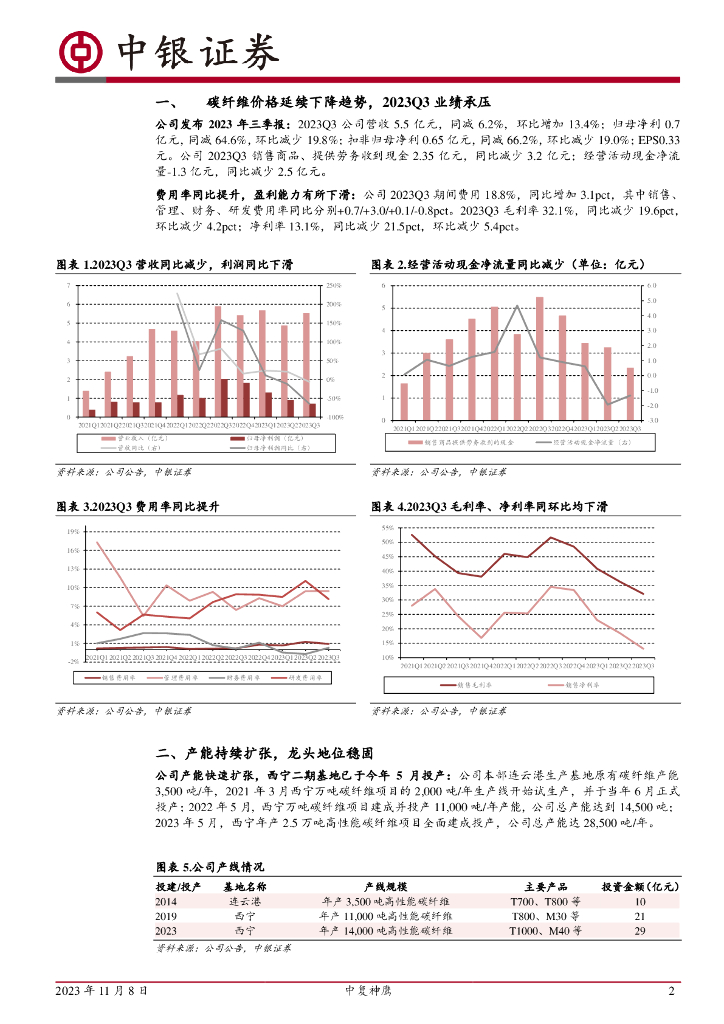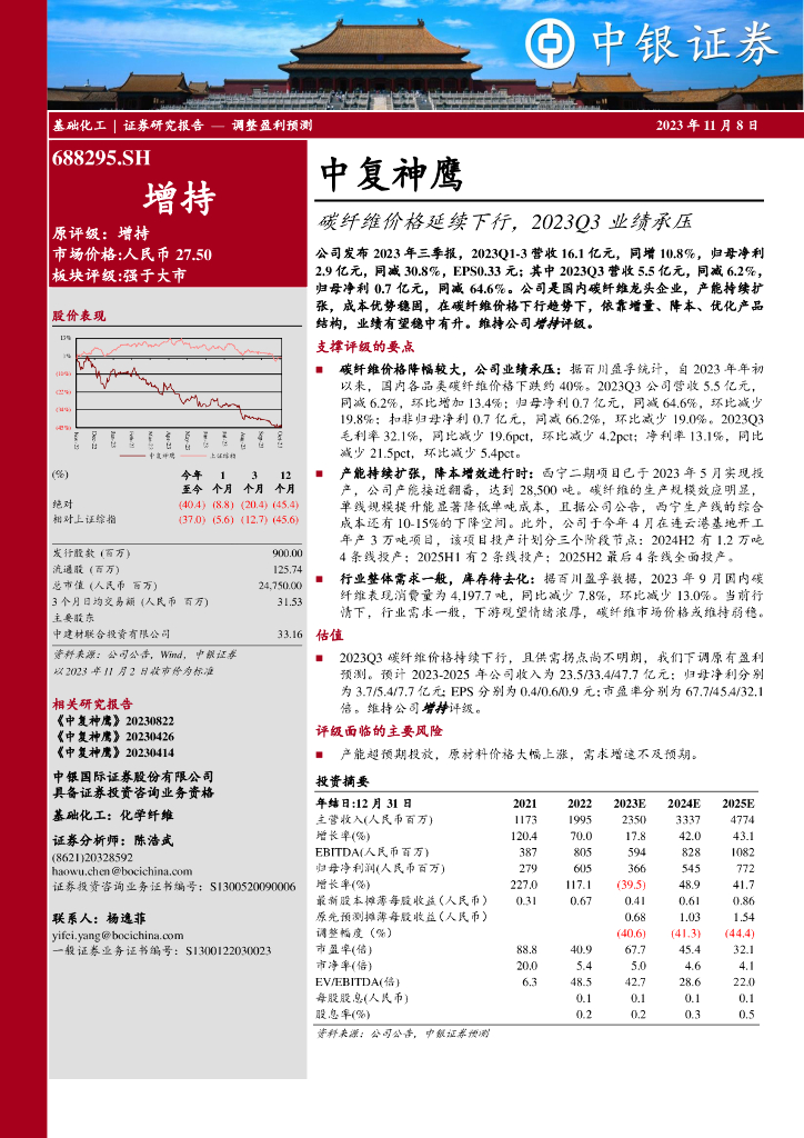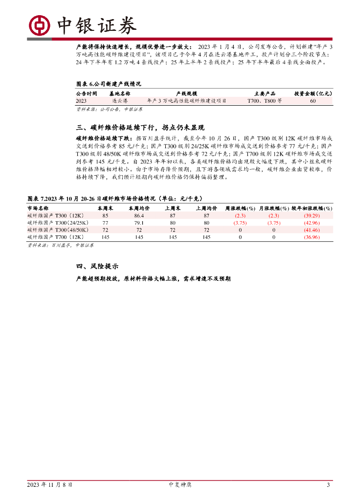 中银证券:中复神鹰(688295)-碳纤维价格延续下行,2023Q3业绩承压.pdf