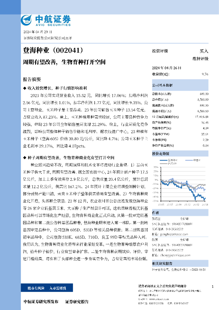 中航证券:登海种业(002041)-周期有望改善,生物育种打开空间.pdf