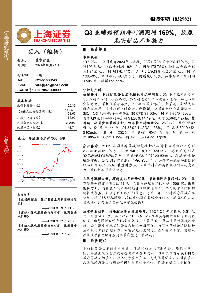 上海证券:锦波生物(832982)-Q3业绩超预期净利润同增169%,胶原龙头新品不断接力.pdf