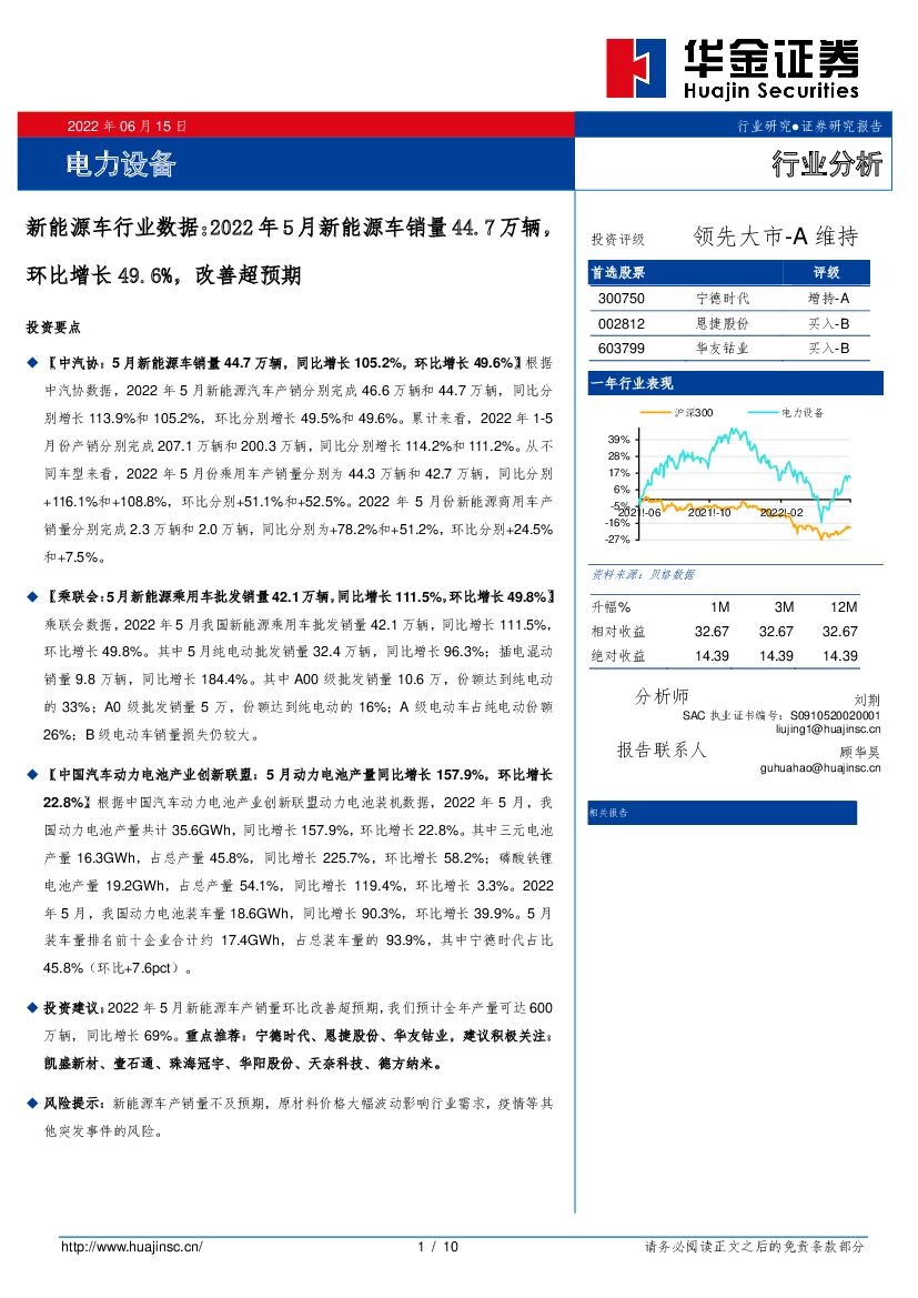 华金证券:电力设备:新能源车行业数据:2022年5月新能源车销量44.7万辆,环比增长49.6%,改善超预期.pdf