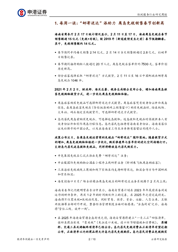 申港证券:休闲服务行业周报:“邮寄送达”添助力 离岛免税销售春节创新高.pdf