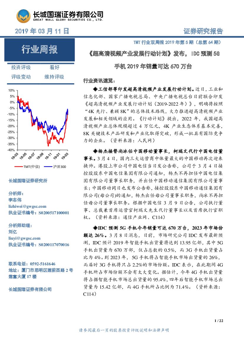 长城国瑞证券:TMT行业双周报2019年第5期(总第64期):《超高清视频产业发展行动计划》发布,IDC预测5G手机2019年销量可达670万台.pdf