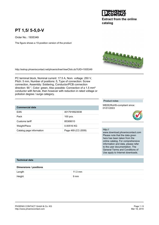 PHOENIX CONTACT PT 1,5/ 5-5,0-V Order No.: 1935349 The figure shows a 10-position version of the product 数据手册.pdf