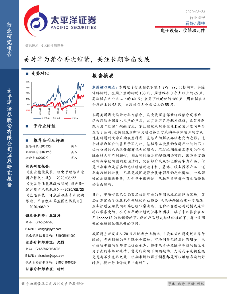 太平洋证券:电子设备、仪器和元件行业周报:美对华为禁令再次缩紧,关注长期事态发展.pdf