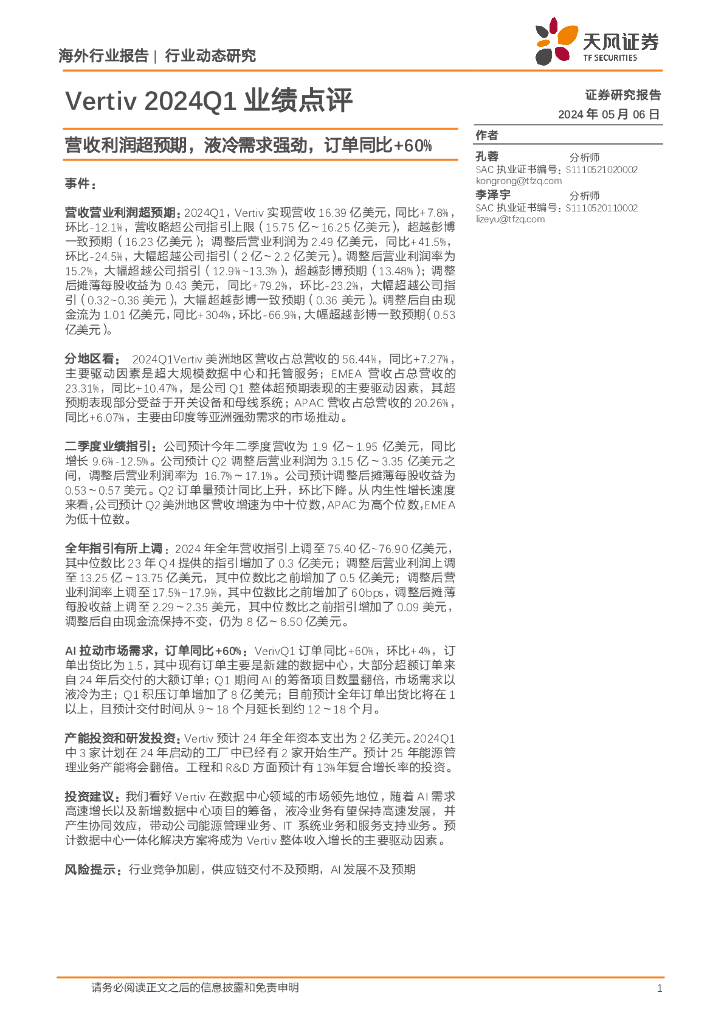 天风证券:Vertiv2024Q1业绩点评:营收利润超预期,液冷需求强劲,订单同比+60%.pdf