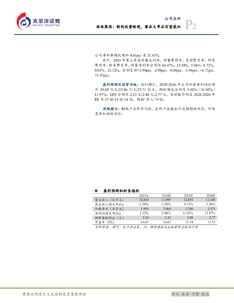 太平洋证券:丽珠集团:制剂放量略慢,潜在大单品有望获批.pdf