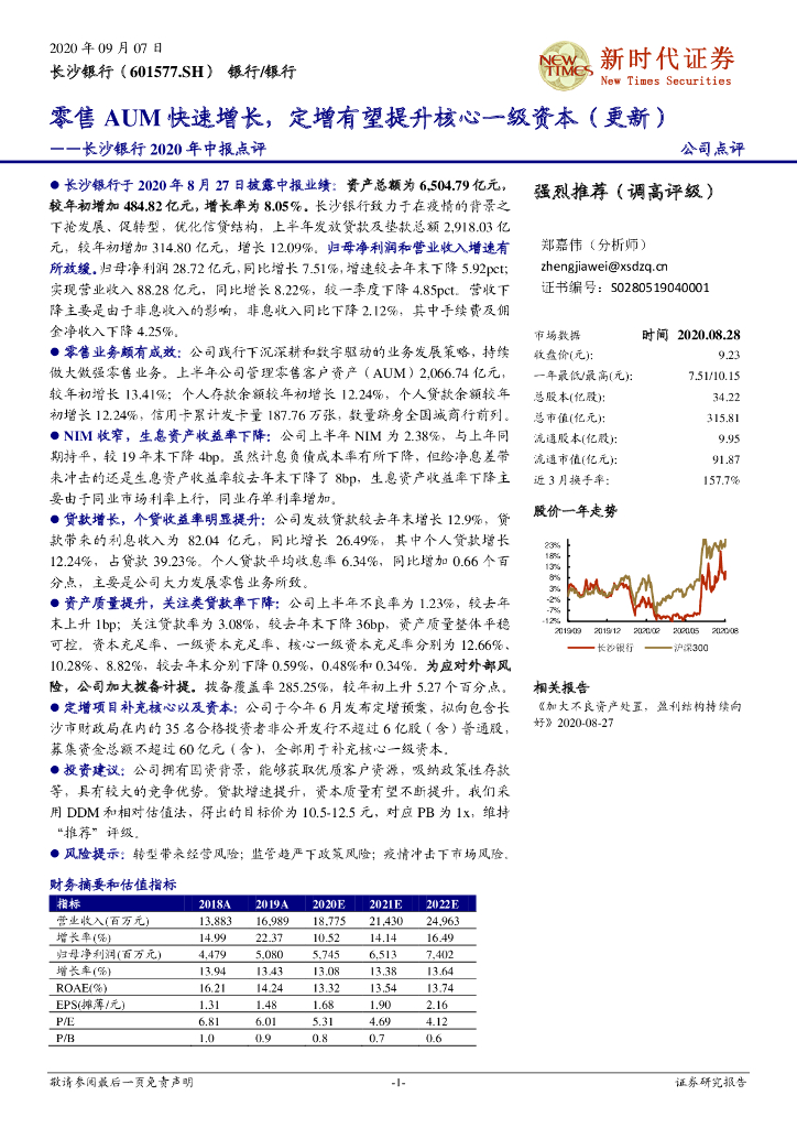 新时代证券:长沙银行2020年中报点评:零售AUM快速增长,定增有望提升核心一级资本(更新).pdf