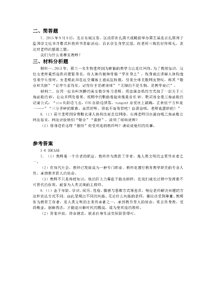 七年级上册 初中道德与法治6.1《走近老师》同步练习.doc