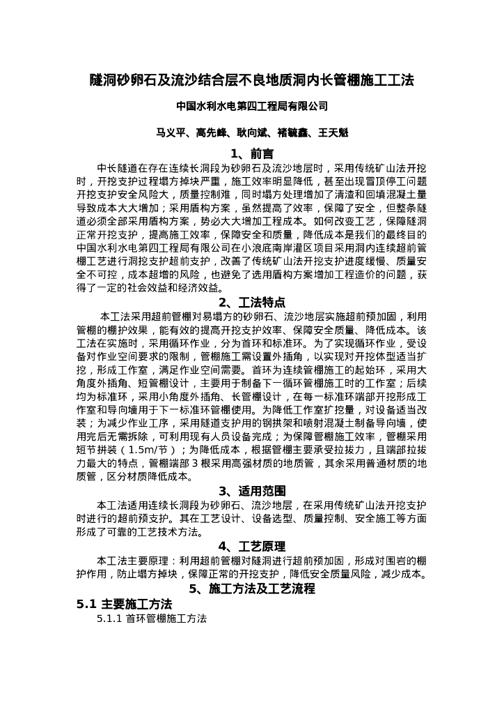 QHGF-2022136 隧洞砂卵石及流沙结合层不良地质洞内长管棚施工工法.doc