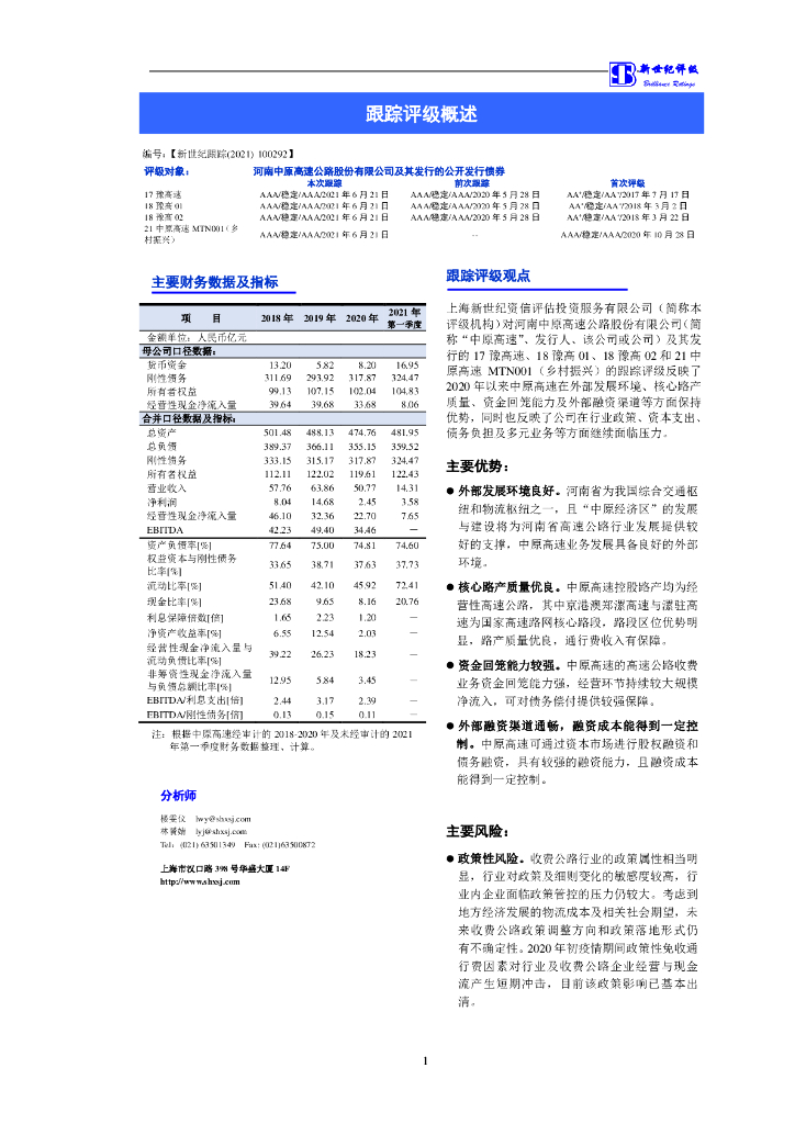 新世纪:河南中原高速公路股份有限公司跟踪评级报告.pdf