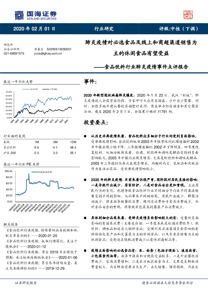 国海证券:食品饮料行业肺炎疫情事件点评报告:肺炎疫情对必选食品及线上和商超渠道销售为主的休闲食品有望受益.pdf