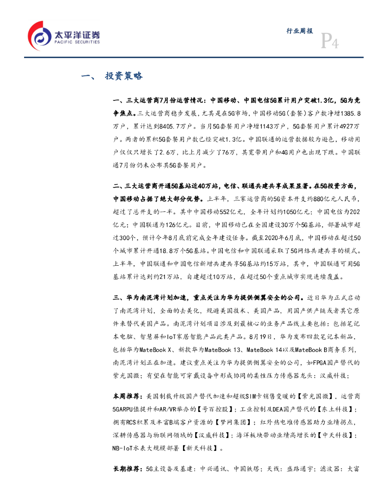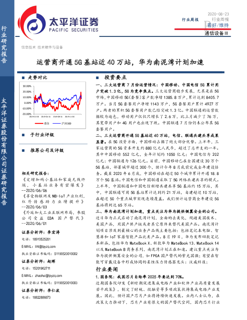 太平洋证券:通信设备Ⅲ行业周报:运营商开通5G基站近40万站,华为南泥湾计划加速.pdf