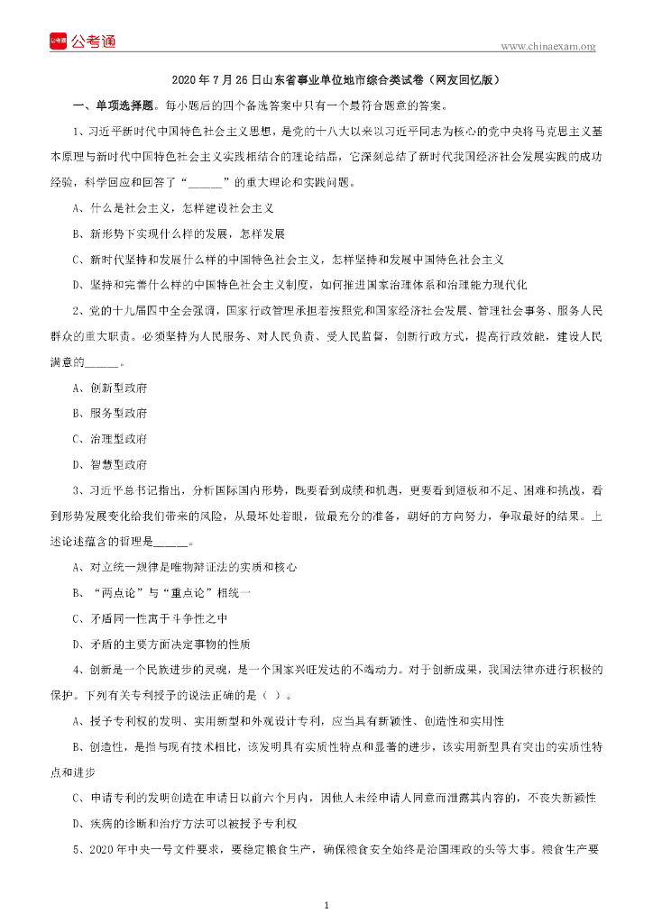 2020年7月26日山东事业单位考试试卷(地市综合类).pdf