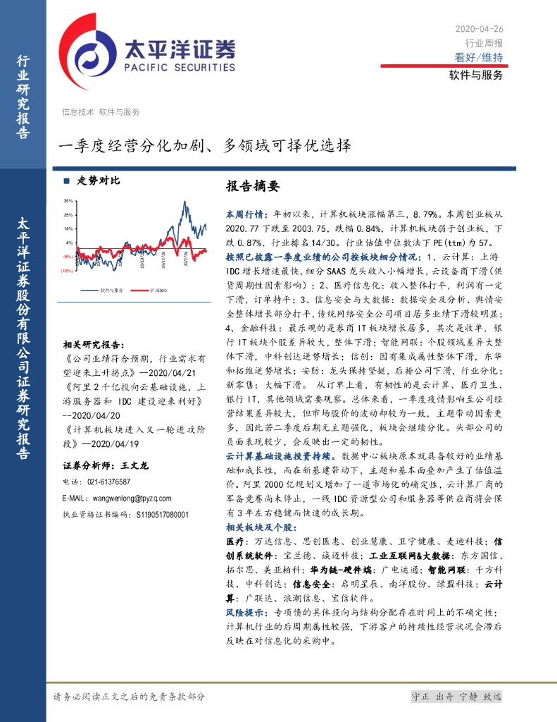 太平洋证券:软件与服务行业周报:一季度经营分化加剧、多领域可择优选择.pdf