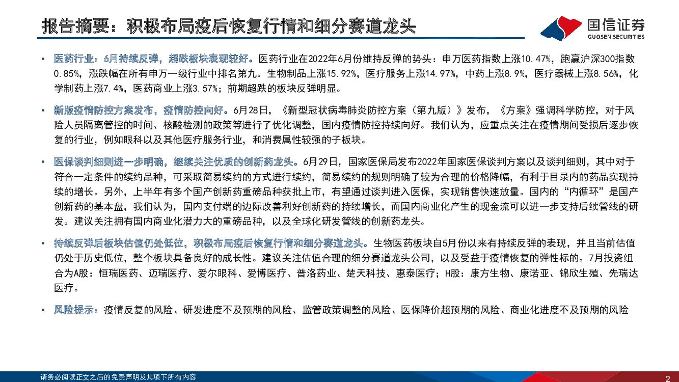 国信证券:医药生物行业2022年7月投资策略:积极布局疫后恢复行情和细分赛道龙头.pdf