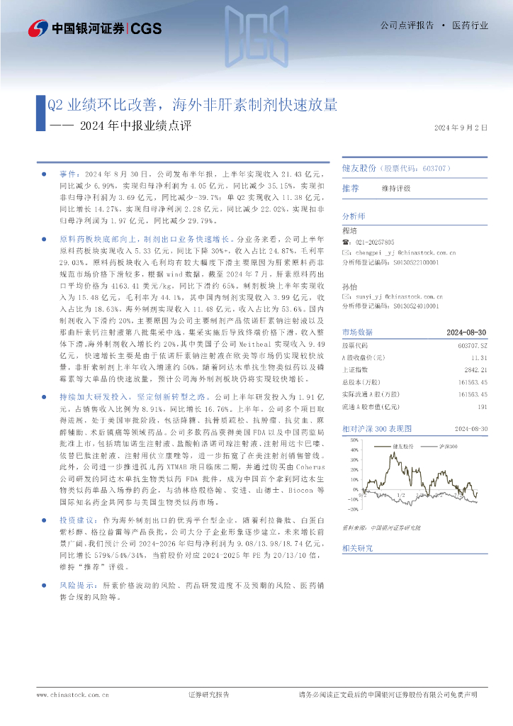 中国银河:健友股份(603707)-2024年中报业绩点评:Q2业绩环比改善,海外非肝素制剂快速放量.pdf