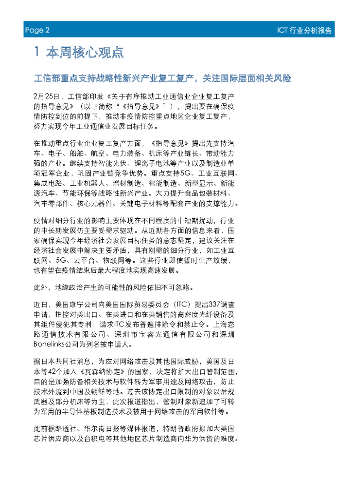 首创证券:ICT行业周报:工信部重点支持战略性新兴产业复工复产,关注国际层面相关风险.pdf
