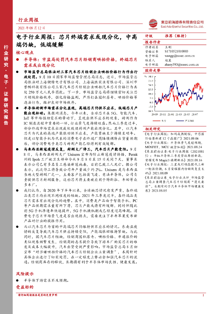 东亚前海证券:电子行业周报:芯片终端需求或现分化,中高端仍缺,低端缓解.pdf