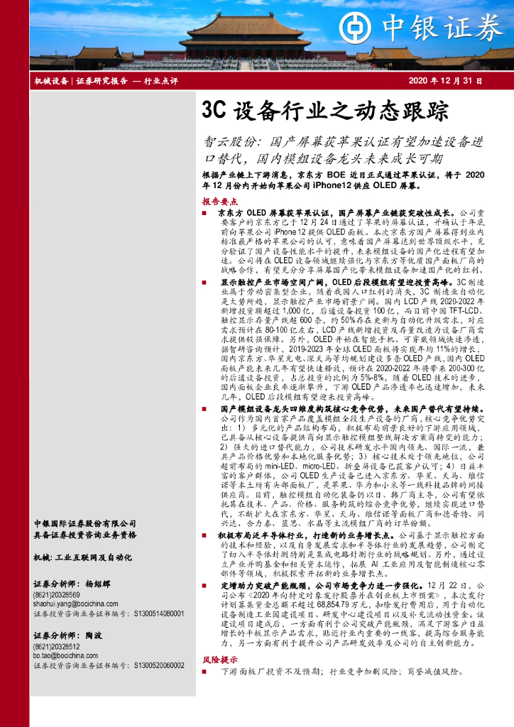 中银证券:3C设备行业之动态跟踪:智云股份:国产屏幕获苹果认证有望加速设备进口替代,国内模组设备龙头未来成长可期.pdf