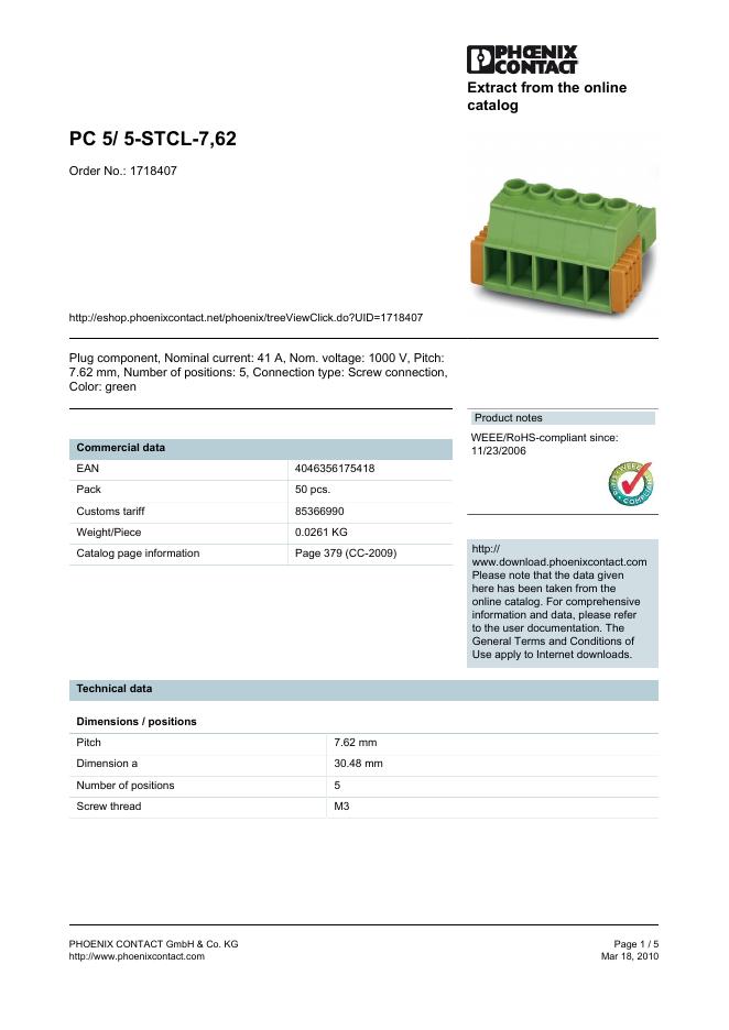 PHOENIX CONTACT PC 5/ 5-STCL-7,62 Order No.: 1718407 数据手册.pdf