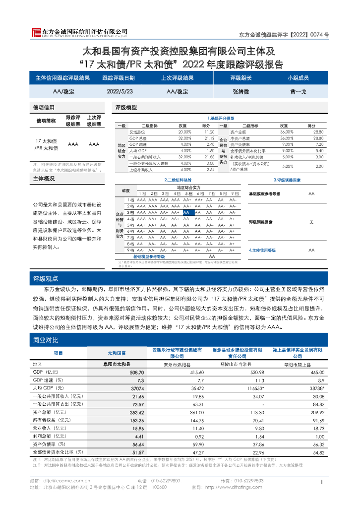 东方金诚:太和县国有资产投资控股集团有限公司主体及“17太和债PR太和债”2022年度跟踪评级报告.pdf