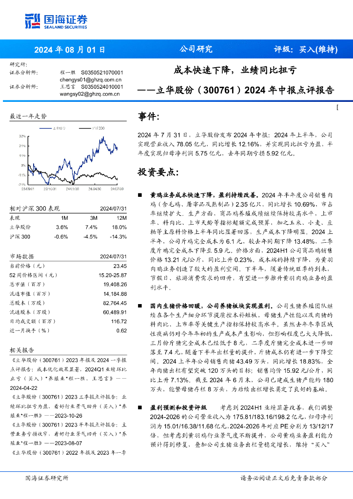 国海证券:立华股份(300761)-2024年中报点评报告:成本快速下降,业绩同比扭亏.pdf
