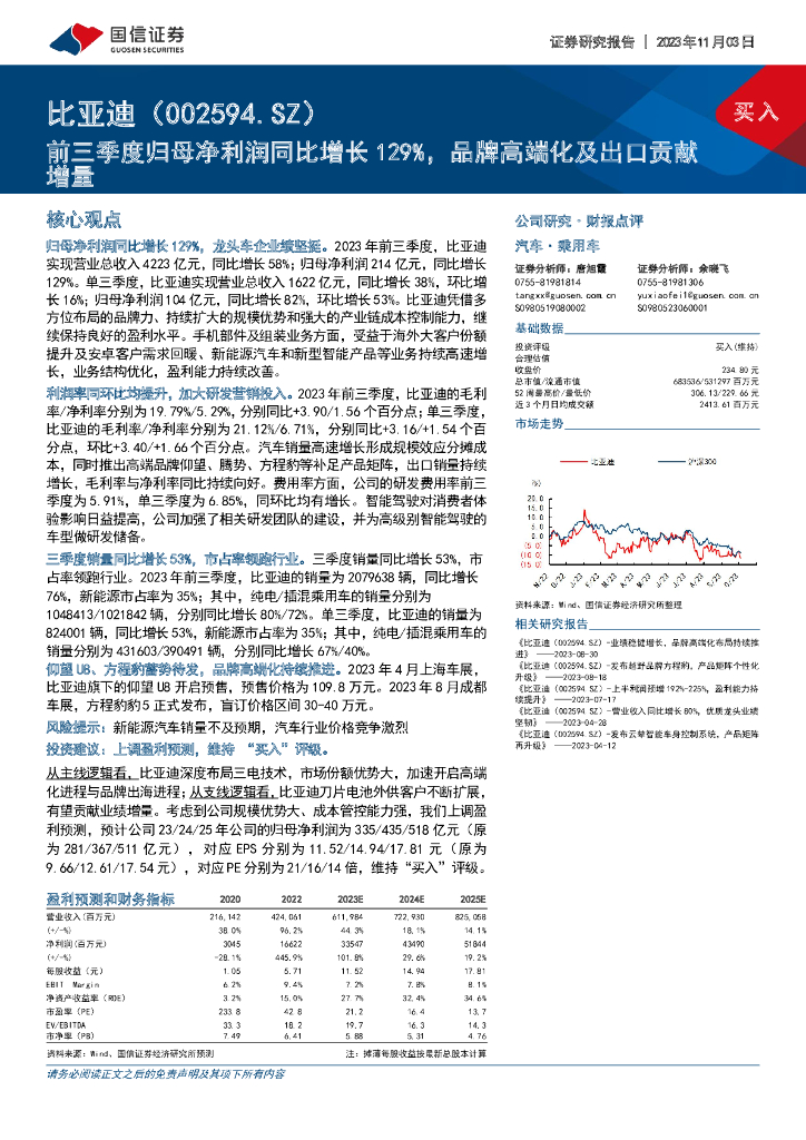 国信证券:比亚迪(002594)-前三季度归母净利润同比增长129%,品牌高端化及出口贡献增量.pdf