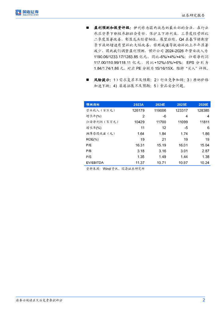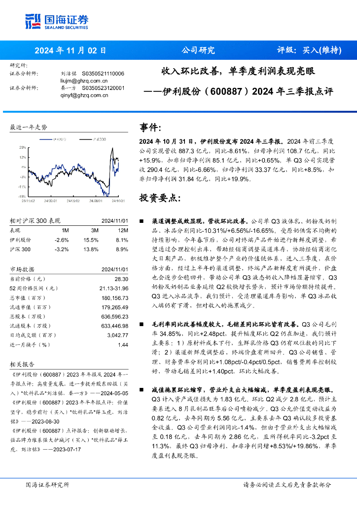 国海证券:伊利股份(600887)-2024年三季报点评:收入环比改善,单季度利润表现亮眼.pdf