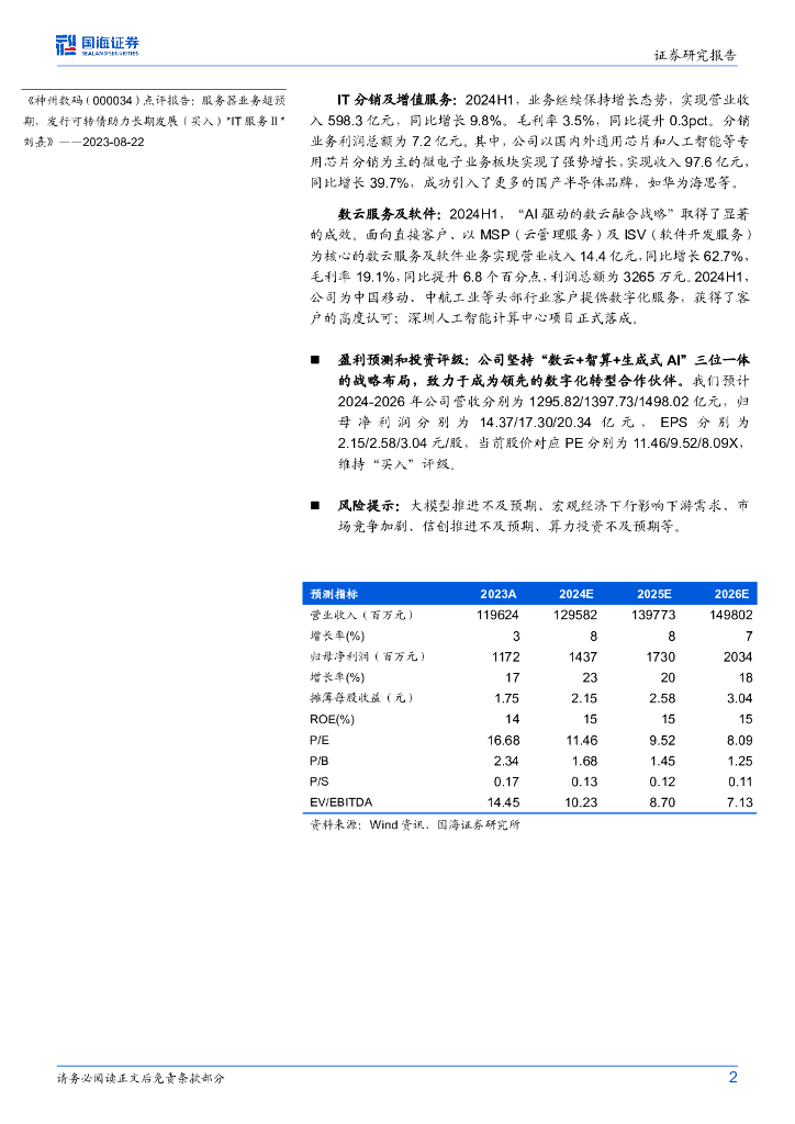 国海证券:神州数码(000034)-2024年半年报点评:2024Q2业绩高速增长,AI驱动自主品牌+数云业务发展.pdf
