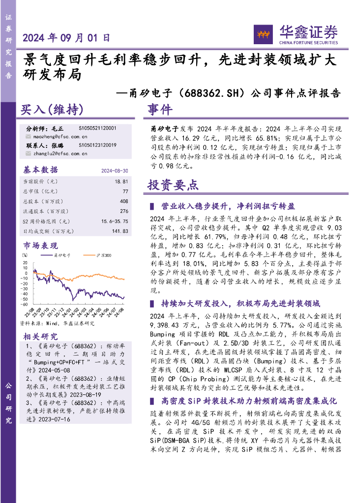 华鑫证券:甬矽电子(688362)-公司事件点评报告:景气度回升毛利率稳步回升,先进封装领域扩大研发布局.pdf
