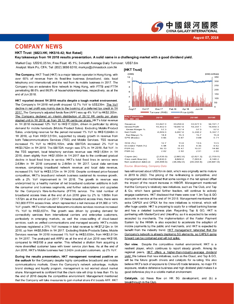 中国银河国际证券:香港电讯-SS(06823)港股公司研究报告-18年中期业绩发布会摘要;逆境中业务稳健的高股息率之选.pdf