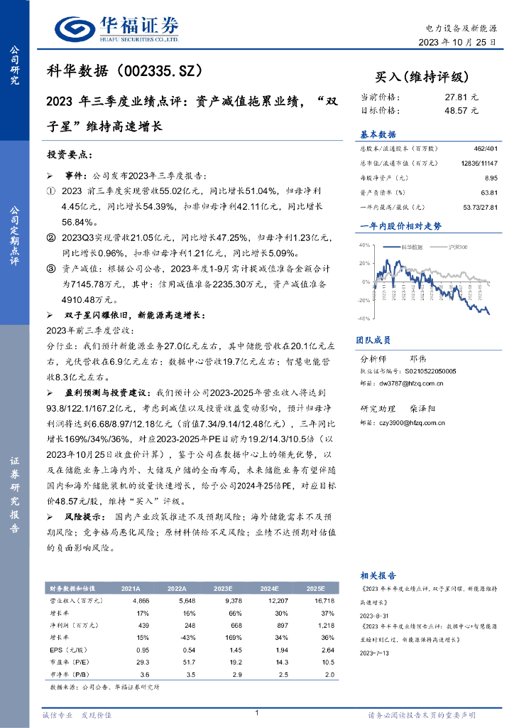 华福证券:科华数据(002335)-2023年三季度业绩点评:资产减值拖累业绩,“双子星”维持高速增长.pdf